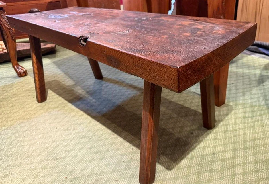 Rustic Bench with 3” Thick Top and Splayed Legs. This can also double as a great Coffee Table!