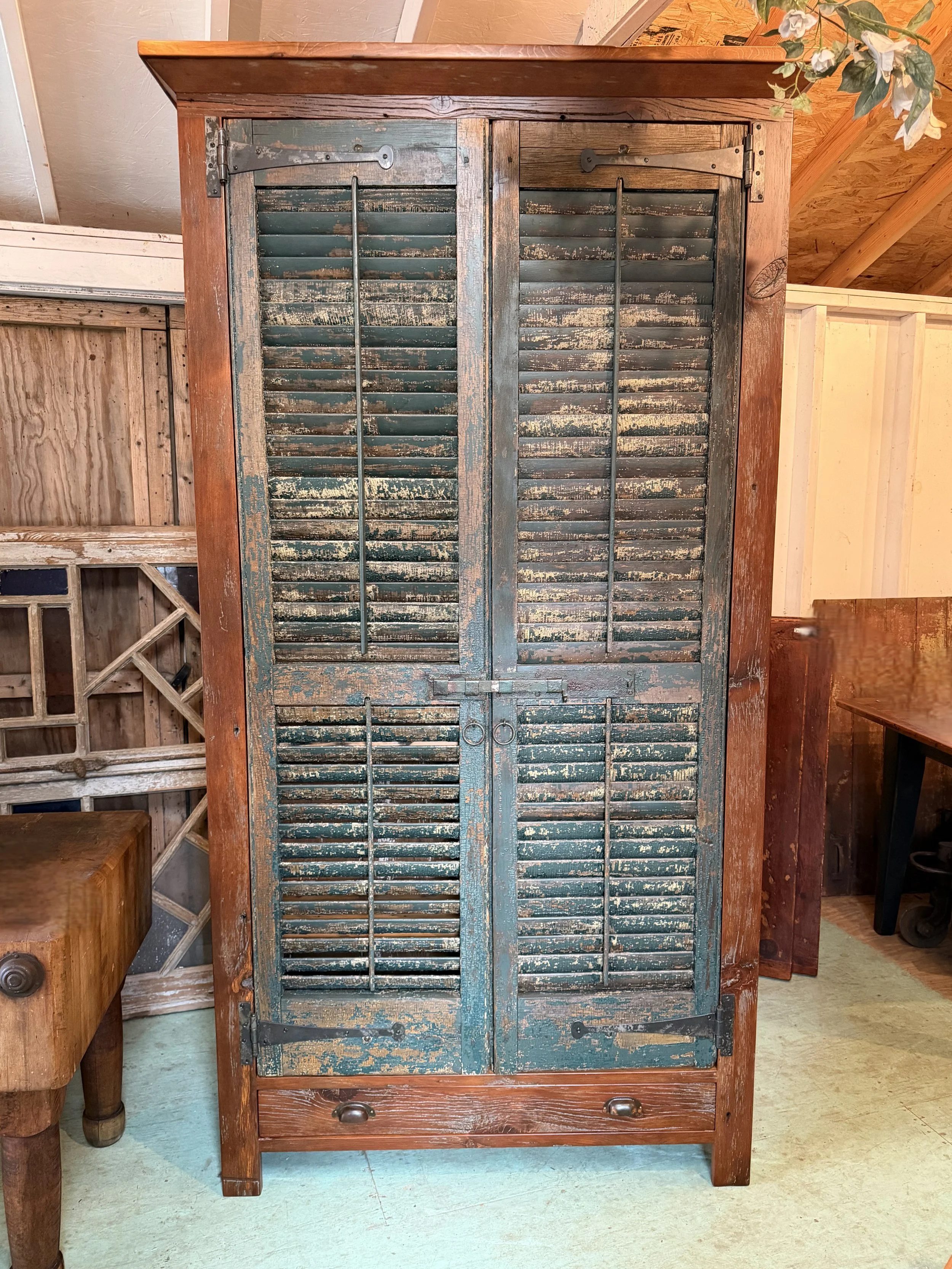 Cupboard with 1800’s Barnwood surrounding authentic Turkish Shutters. Gorgeous!!