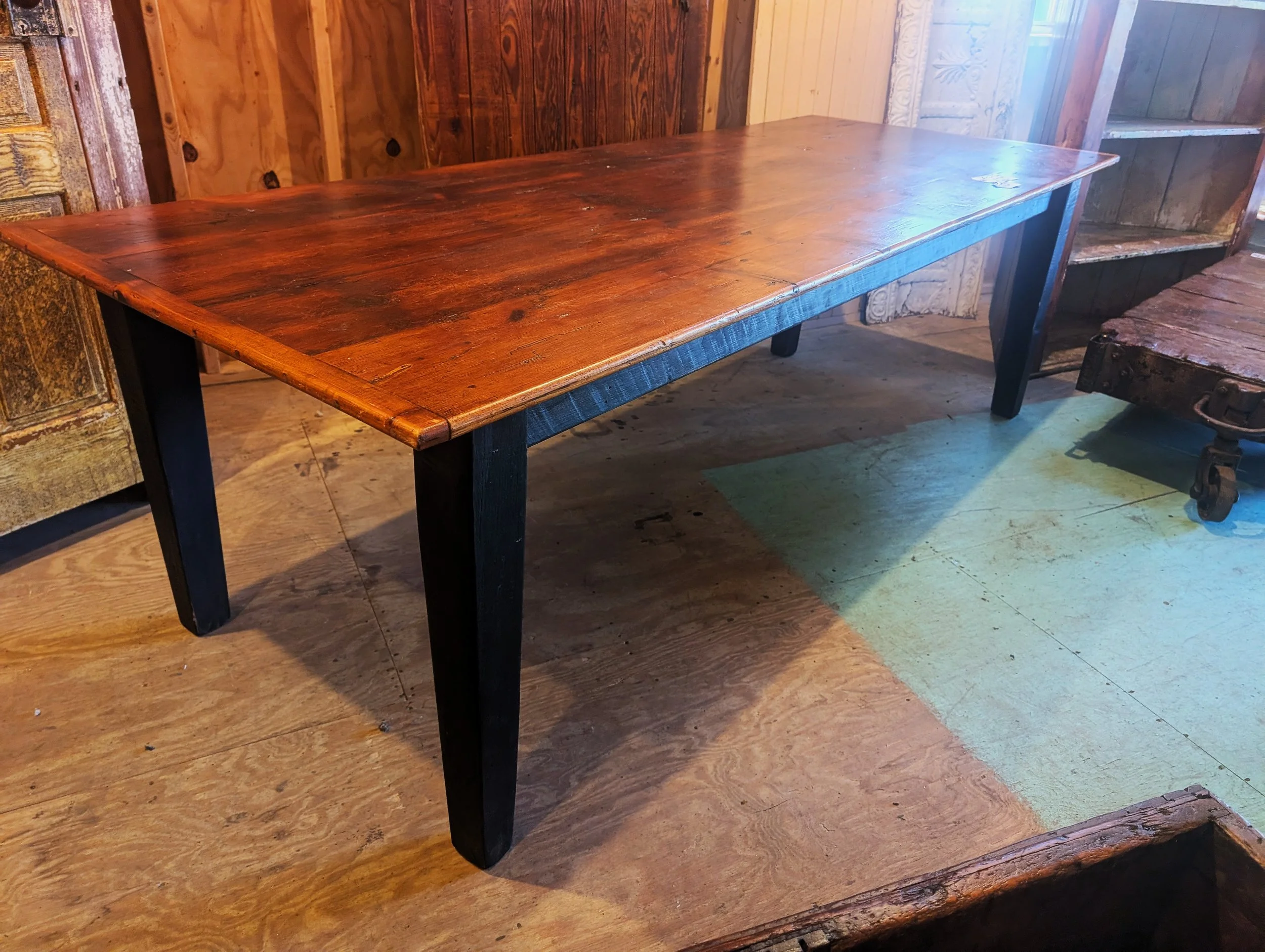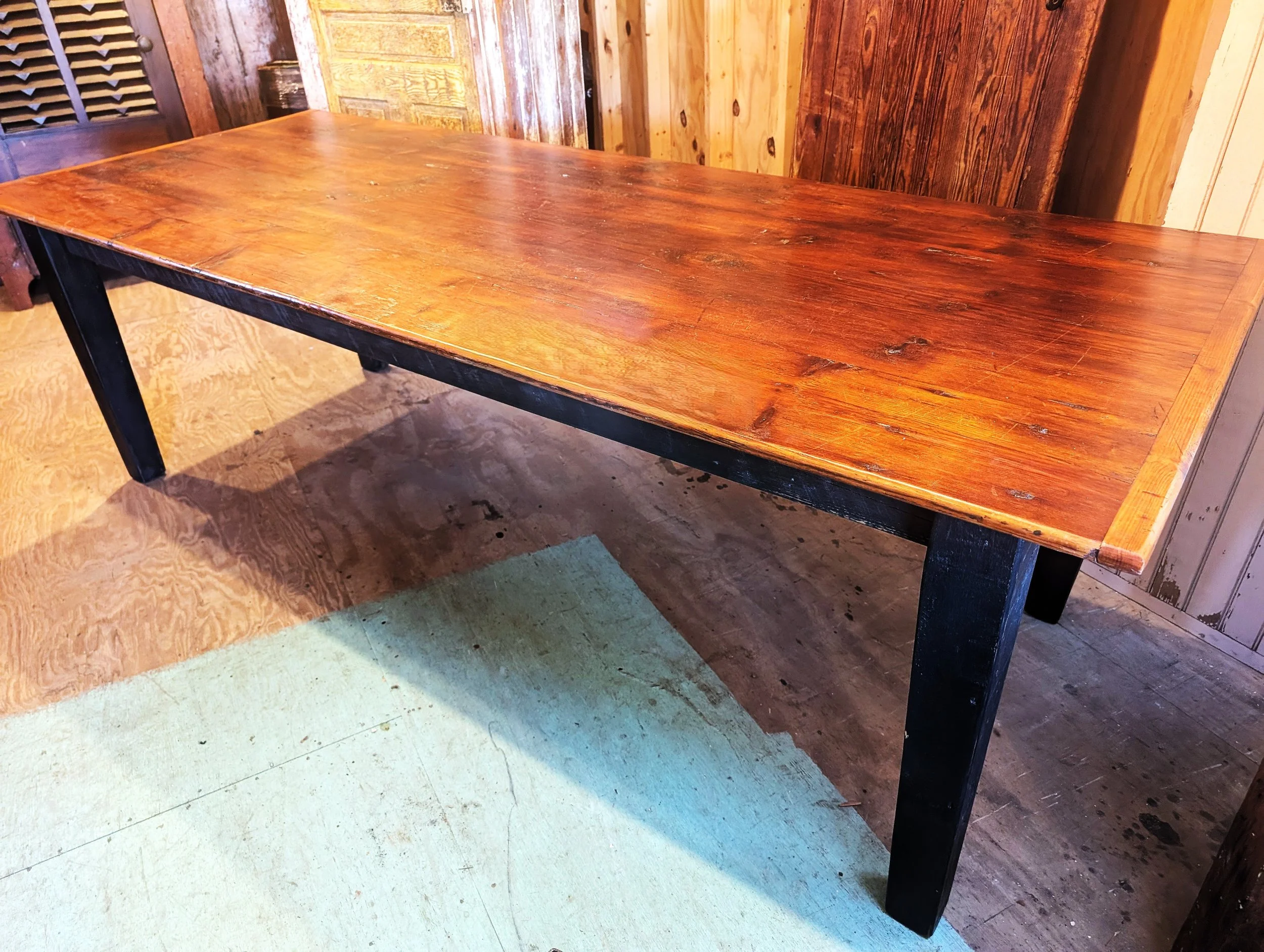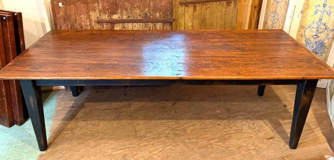 Farm Table made from reclaimed 1800’s Barnwood with a 2” table top in a medium brown finish with base in black paint.