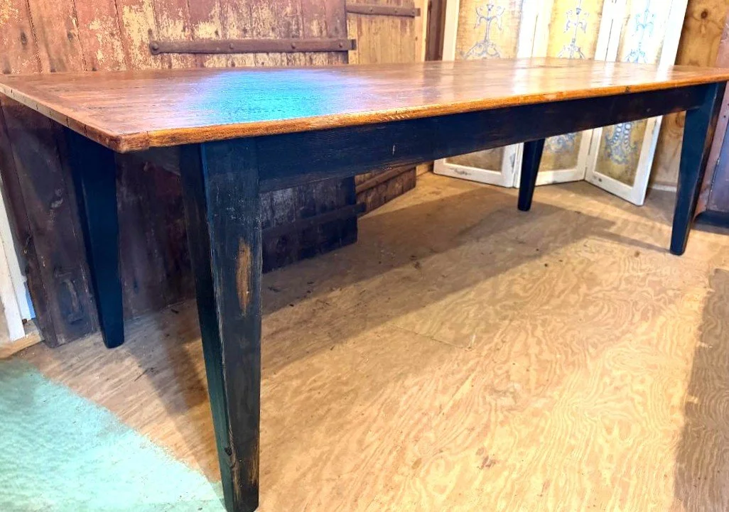 Farm Table made from reclaimed distressed painted 1800’s Barnwood with a 3” table top in a medium brown finish.