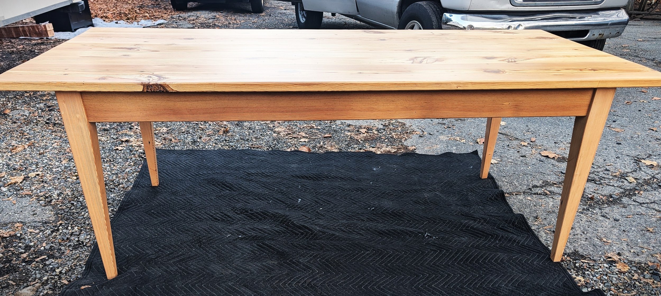 Farm Table made of 1800’s reclaimed Barnwood in a Natural Finish, including multiple layers of polyurethane. This table boasts tapered legs which are slimmer in design.