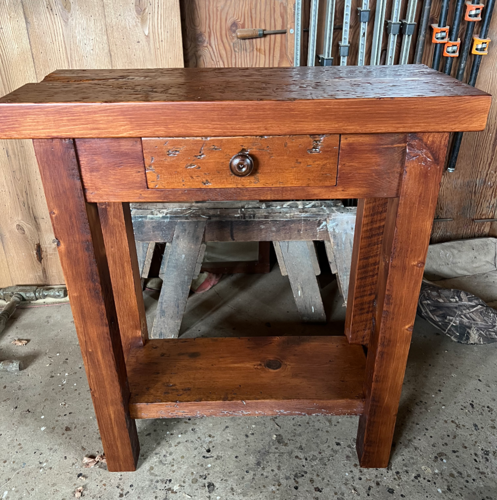 Slab of Live Edge Flaming Box Elder as the top of a Console. The red flames in the wood are natural, and brought out by the finish.